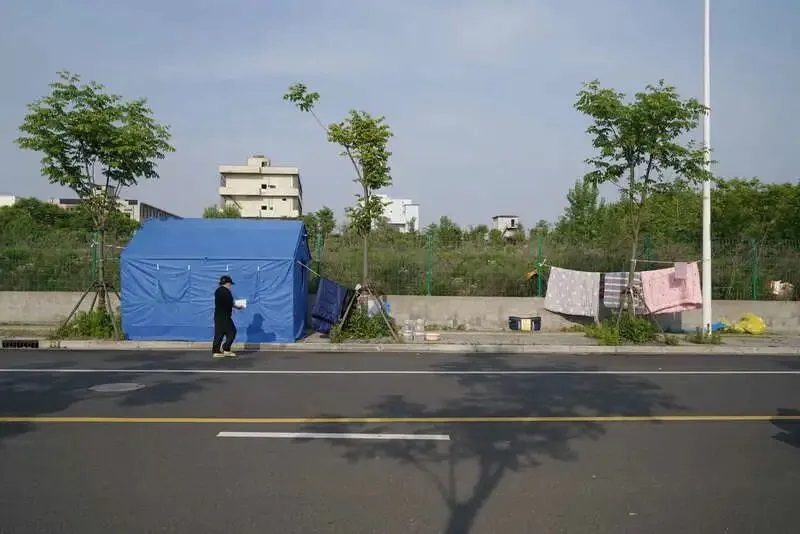 5月2日,上海市閔行區,一家三口從方艙出院后,原房東不愿再將房子租給他們,他們無法回到租住小區,被臨時安置在小區附近的救災帳篷里。中青報·中青網記者 李強/攝