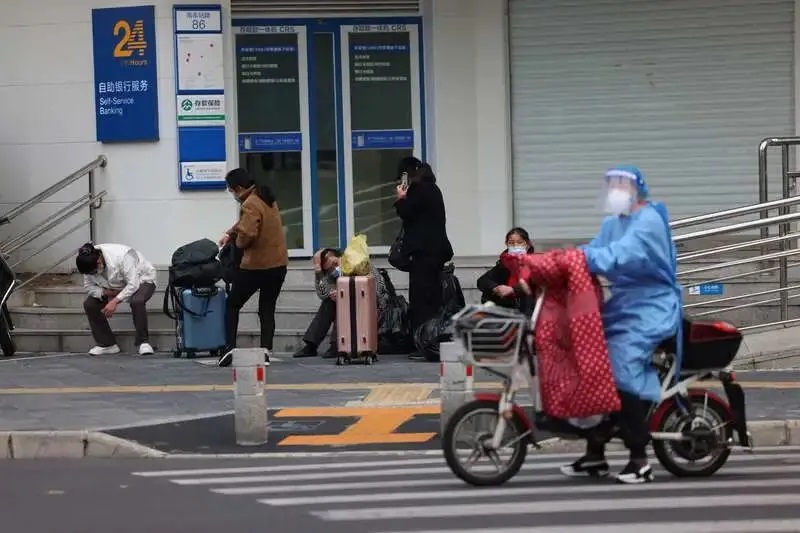 4月27日,上海市黃浦區,5位住在群租房里的外來務工者待在小區外。由于她們沒有暫住證,也擔心她們“復陽”,影響小區內其他人,小區不允許他們入住。中青報·中青網記者 李強/攝