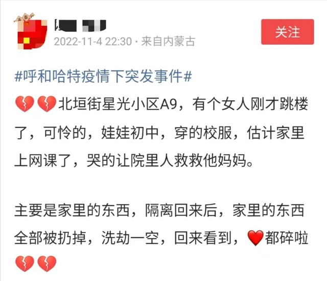 跳樓悲劇讓大半個(gè)呼和浩特市民徹夜無(wú)眠,到底同李副局長(zhǎng)公布的“抄家式消殺”有無(wú)關(guān)聯(lián)?似乎,呼和浩特應(yīng)該給出一個(gè)明確的回應(yīng)。