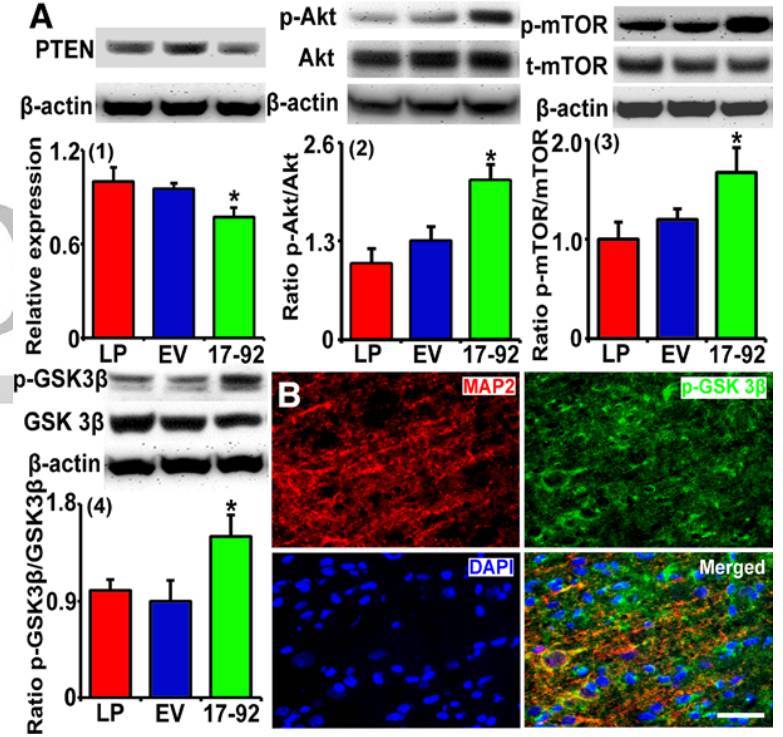 間充質(zhì)干細(xì)胞治療中風(fēng)的功能和機(jī)制研究:間充質(zhì)干細(xì)胞通過外泌體中miR-17-92調(diào)控PTEN表達(dá)從而激活PI3K/Akt/mTOR 通路調(diào)控神經(jīng)元可塑性,并促進(jìn)中風(fēng)后功能恢復(fù)。