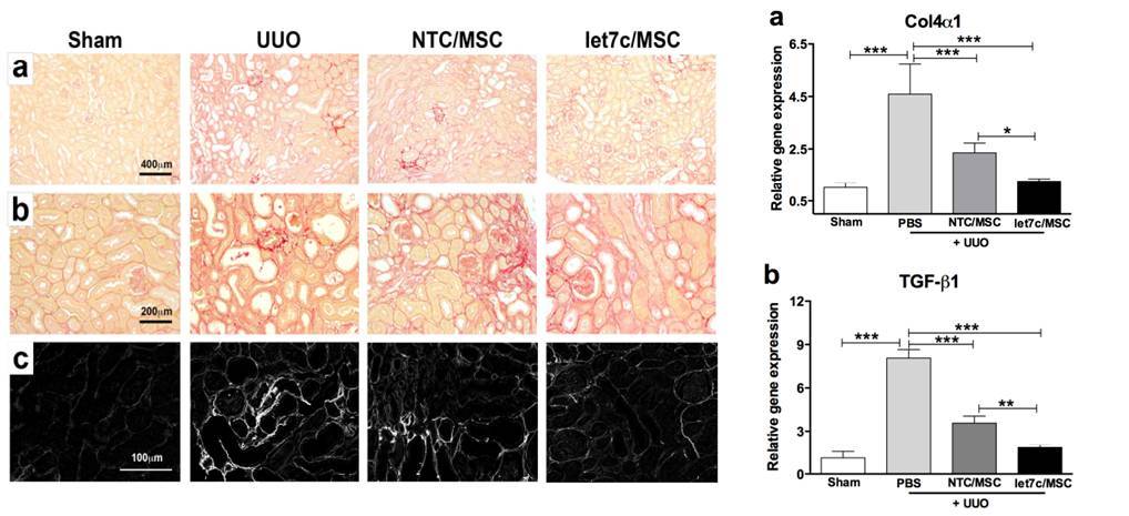間充質(zhì)干細(xì)胞治療腎纖維化的功能和機(jī)制研究:間充質(zhì)干細(xì)胞通過外泌體中let7c調(diào)控TGFβ、膠原蛋白IVα 1和mmp9等表達(dá)抑制腎纖維化。