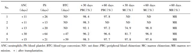 蘇州大學附屬第一醫院為異基因造血干細胞移植后出現aGVHD的5位白血病患兒輸注臍帶間充質干細胞,輸注10天后,5位患兒均獲造血重建,皮疹消退, 肝功能恢復正常, 胃腸道癥狀好轉 ,患兒均未發生輸注相關不良反應。目前患兒均無原發病的復發, 均處于無病生存狀態(表4) 。