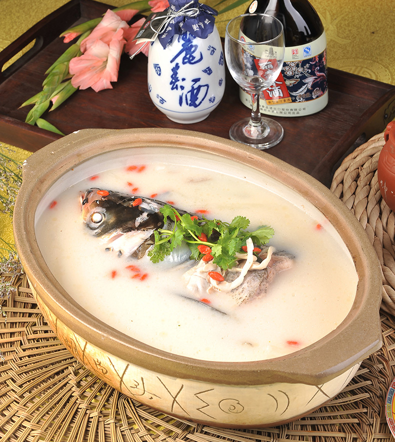 選用特別訂制的江蘇宜興魚頭紫砂砂鍋,將魚頭下鍋煎黃后撈出,放入砂鍋,注入天目湖水,輔以蔥結、生姜、料酒、香醋、香菜、胡椒等,撇除浮油,在火上煨煮數小時,一道白里透紅,細嫩無比,鮮美絕倫的天目湖砂鍋魚頭就可以上桌了。
