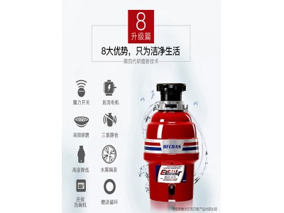 貝克巴斯是*早引進食物垃圾處理器的公司。成立于1997年,并承接一個使用食物垃圾處理器的精裝項目“密云云湖度假村”。行業(yè) 內(nèi)*一擁有尖端恒速直流永磁電機及四級研磨技術(shù)的公司以卓越的產(chǎn)品性能與完善的安裝及售后服務體系而著稱,在各渠道銷量均名列前茅。貝 克巴斯食物垃圾處理新主張,省時省力、衛(wèi)生健康。8大優(yōu)勢,只為潔凈生活。力開關(guān),無須打孔。遙控開啟,輕輕一按,搞定廚余垃 圾。強勁直流永磁電機,啟動扭矩大,拒*卡頓。*效研磨,處理更多廚余。三重靜音,拒*擾民。高度降低,節(jié)省空間。底部設(shè)計,預留更多空 間。水膜隔音防濺罩,具有良好的隔音效果,減少填塞阻力。連接洗碗機,省時省力,洗碗同時處理殘余垃圾。水槽口配有磁環(huán),有效減少刀 叉等鐵質(zhì)金屬物品掉入機器內(nèi)部的幾率。用心細節(jié),呵護你的健康。