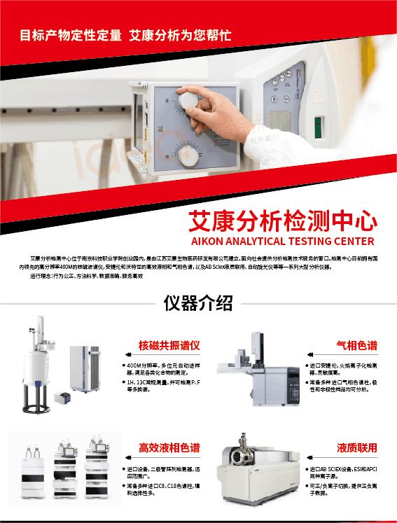 南京艾康全心分析檢測中心目前擁有國內xian進的高分辨率400M的核磁共振波譜儀,全套Agilent系列的液質聯用儀、氣質聯用儀、高效液相儀、氣相色譜儀以及各種理化分析儀器等一系列大型分析儀器。
