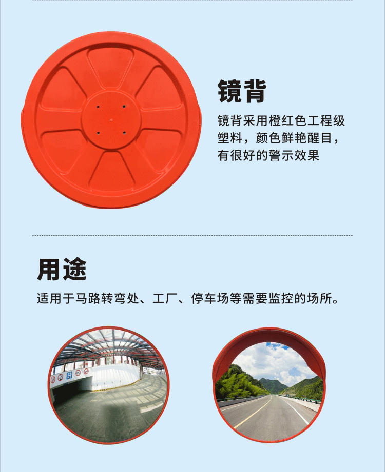 (特別是無信號的交叉路口)、鐵路道口等處,為幫助駕駛者,行人對其通視受到限制的車轍,行人得以識別清楚,防止發生事故,而設置道路廣角鏡。本來道路的幾何線形要求,沒有必要設置廣角鏡,但實際確有通視極其惡劣,而需要設置廣角鏡的這樣地點。道路廣角鏡能將另一方的車輛或行人映照出來,并且又由于路上設有道路廣角鏡的這一設置本身,就具有防止事故的效果,所以在必要的地點是應該設置的。